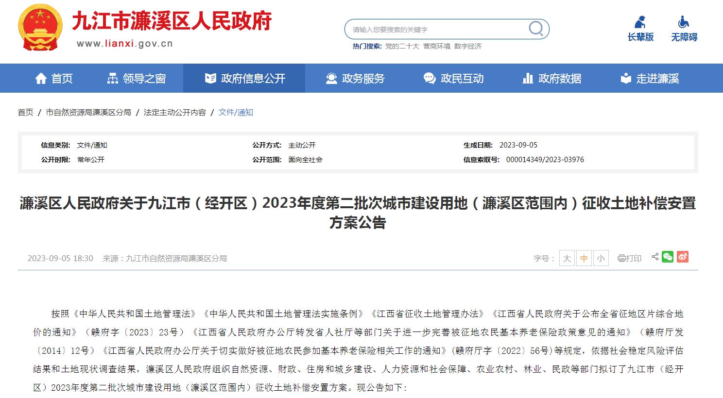 近日,濂溪區人民政府官網發布了《濂溪區人民政府關于九江市(經開區)2023年度第二批次城市建設用地(濂溪區范圍內)征收土地補償安置方案公告》!具體情況如下: