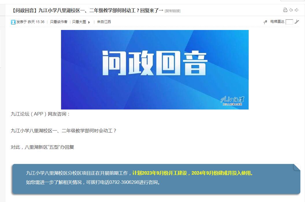 九江小學八里湖校區(qū)一、二年級教學部何時動工?回復來了→